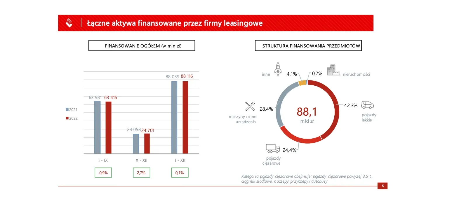 Zgodnie z informacjami ZPL, w 2022 roku firmy leasingowe udzieliły firmom łącznego finansowania w wysokości 88 116 mln zł. W porównaniu do 2021 r. jest to wynik niemal identyczny, z symbolicznym wzrostem 0,1% r/r. W strukturze finansowania aktywów nie nastąpiły znaczące zmiany, poza mniejszym o około 2% udziałem pojazdów, zarówno lekkich, jak i ciężarowych.