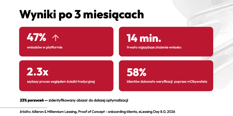 Podczas tegorocznej konferencji „E-Leasing Day 8.0” Kamil Portka, członek zarządu Ailleron, oraz Piotr Maj, członek zarządu Millennium Leasing, zaprezentowali wyniki Proof of Concept (PoC) jako narzędzie realnej walidacji biznesowej. Punktem wyjścia była jasna hipoteza: czy klient jest w stanie samodzielnie przejść przez pierwsze, kluczowe etapy procesu leasingowego w modelu cyfrowym.