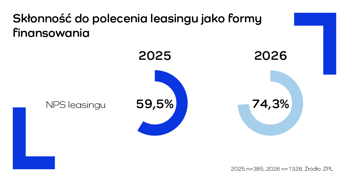 Warszawa, 20 kwietnia 2026 r. – Leasing w Polsce osiągnął wyjątkowo wysoki poziom satysfakcji klientów. W najnowszym badaniu Związku Polskiego Leasingu wśród klientów firm leasingowych wskaźnik NPS wzrósł do +74,3 z +59,5 rok wcześniej, co jest najwyższym wynikiem w historii pomiarów i potwierdza rosnącą skłonność przedsiębiorców do rekomendowania tej formy finansowania. Co istotne, tegoroczna edycja badania została przeprowadzona na znacząco większej próbie – objęła 1328 przedsiębiorców, wobec 385 rok wcześniej – co dodatkowo wzmacnia wiarygodność uzyskanych wyników i potwierdza trwały charakter obserwowanego trendu.