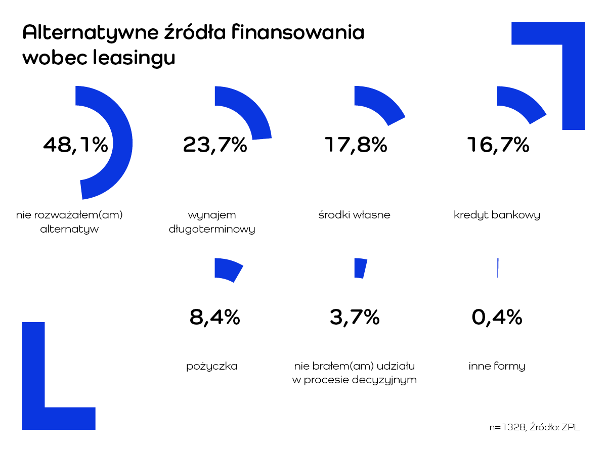 Jeśli firmy analizują inne opcje, leasing konkuruje przede wszystkim z najmem długoterminowym (23,7 proc. badanych), finansowaniem z pieniędzy własnych (17,8 proc.) oraz kredytem bankowym (16,7 proc.).