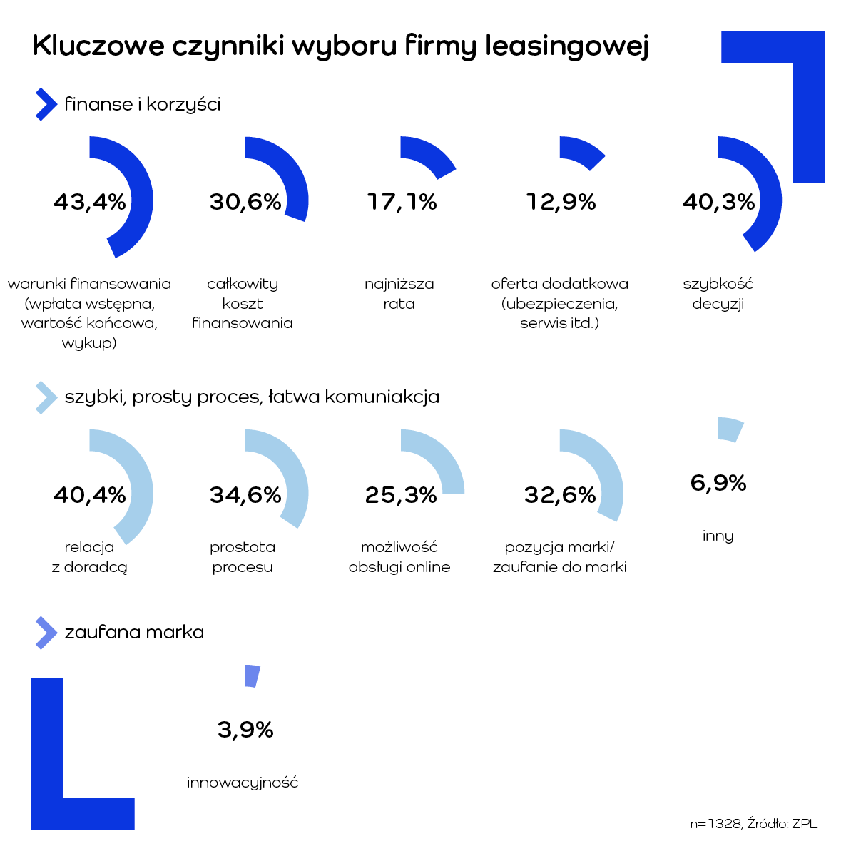 Z badania wynika, że o wyborze konkretnej firmy leasingowej decyduje dziś kombinacja kilku czynników. Przedsiębiorcy najczęściej wskazują 2–3 kluczowe elementy, wśród których dominują warunki i parametry finansowe, ale równie istotne pozostają szybkość i prostota procesu, jakość komunikacji oraz zaufanie do marki.