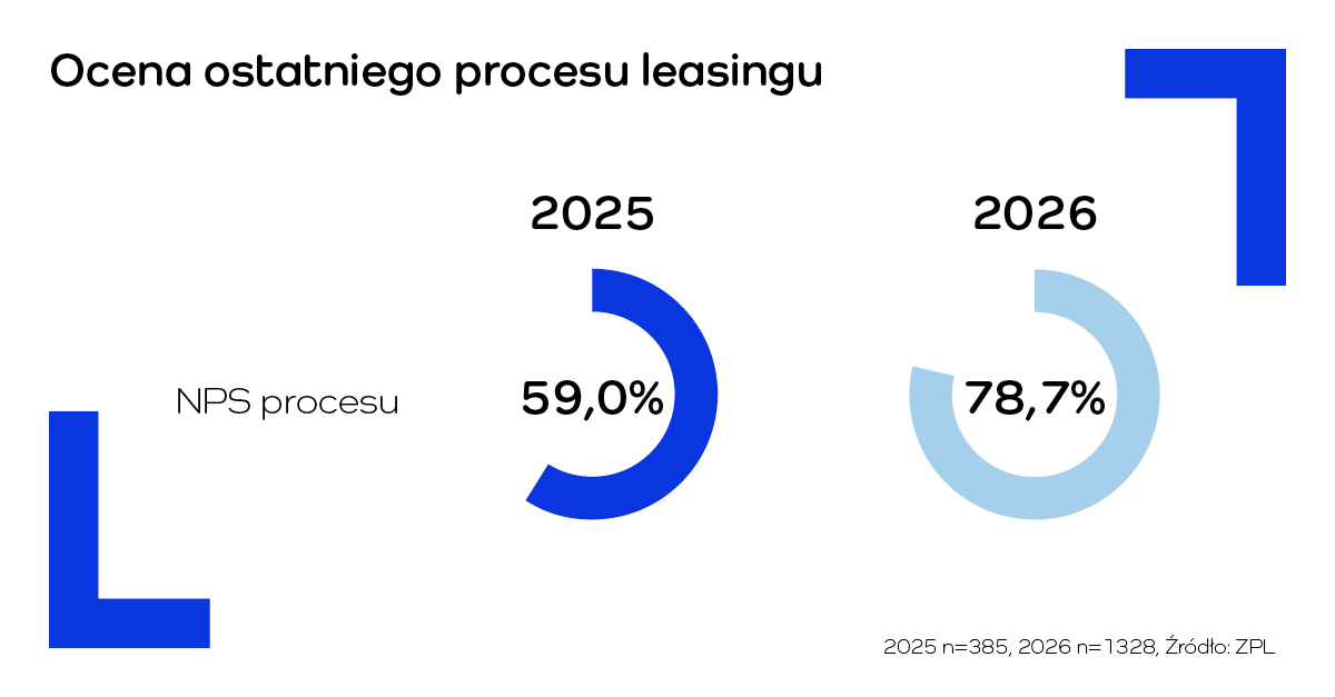 Wysokie oceny znajdują odzwierciedlenie w doświadczeniu klientów. 79 proc. przedsiębiorców pozytywnie ocenia swój ostatni proces zawarcia umowy leasingu, podczas gdy 13 proc. pozostaje neutralnych, a jedynie 4 proc. ocenia go krytycznie. W porównaniu z wynikami z 2025 roku ocena ostatniego procesu lepsza - wskaźnik NPS wzrósł znacznie z 59 w 2025 do 78,7 w 2026 roku. Jest to różnica istotna statystycznie.