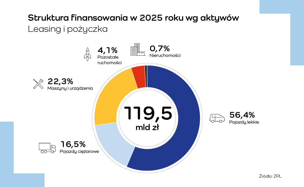 Zdecydowanie szybciej niż leasing rosło finansowanie pożyczką leasingową. W 2025 roku jej wartość wzrosła o 27,1 proc., do 17,3 mld zł. Leasing pozostawał jednak dominującą formą finansowania – wartość sfinansowanych w ten sposób aktywów wyniosła 102,1 mld zł, co oznacza wzrost o 5,5 proc. r/r.