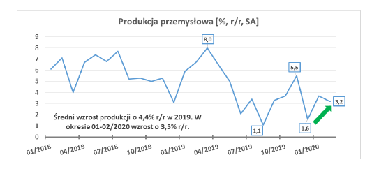 2. Zarówno ubiegłoroczne wyniki finansowania maszyn, jak i uzyskane za 01-02 2020 roku, wydają się być poniżej ekonomicznych fundamentów naszej gospodarki. Do lutego odnotowywany był wysoki wzrost gospodarczy, czego odzwierciedleniem były wyniki produkcji przemysłowej w tym okresie: