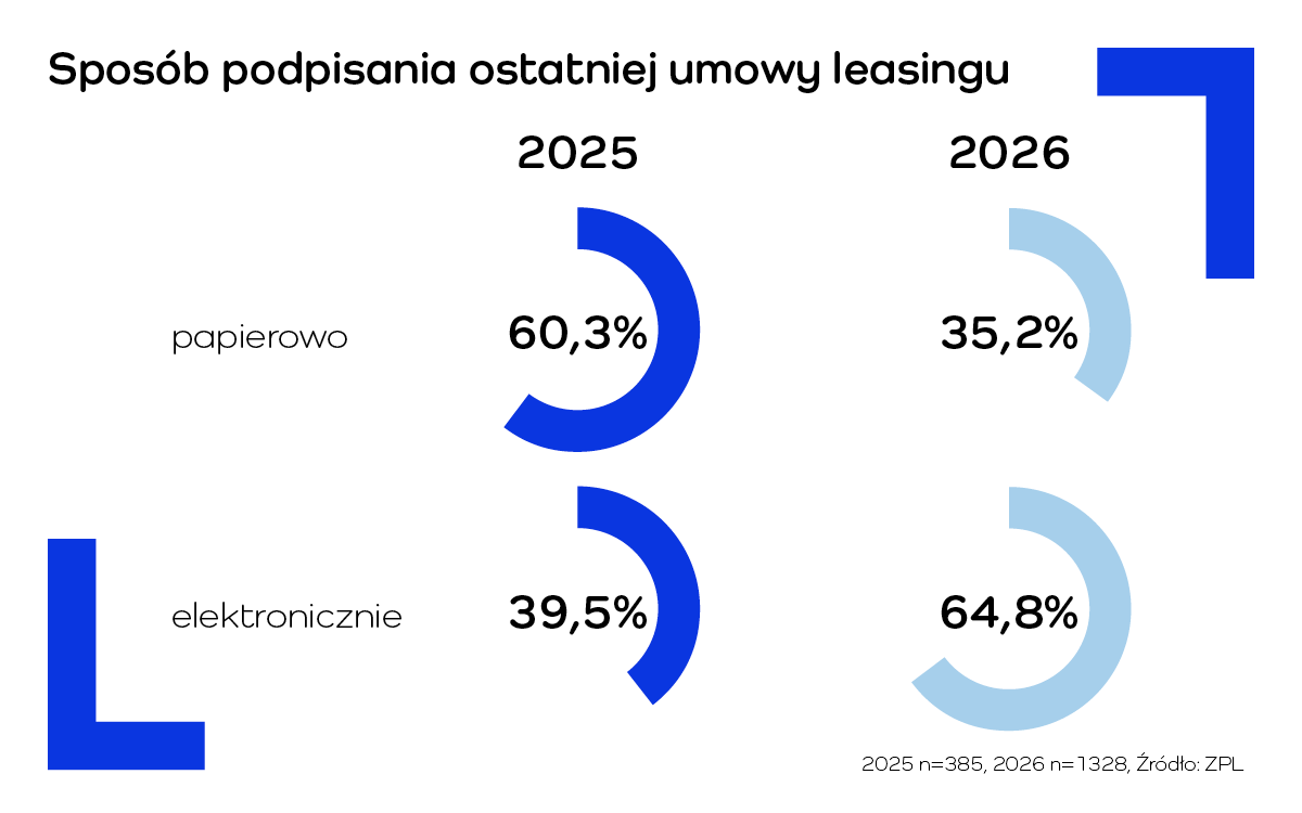 Jednocześnie inne badania przeprowadzone nie wśród klientów, a wśród firm leasingowych wskazują, że udział umów zawieranych w pełni cyfrowo również systematycznie rośnie – w 2025 r. wyniósł 39,4 proc., wobec 29,6 proc. rok wcześniej – co potwierdza kierunek transformacji całego sektora. Dane te są spójne z obserwacją, że im mniejsza firma-klient, tym wyższy jest odsetek umów zawieranych elektronicznie, co wynika z prostszych procesów decyzyjnych i większej standaryzacji finansowania w segmencie najmniejszych przedsiębiorstw.