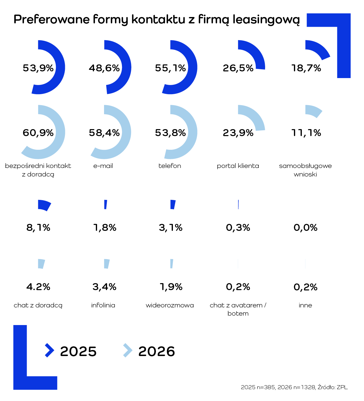 Przedsiębiorcy najczęściej preferują tradycyjne formy komunikacji – bezpośredni kontakt z doradcą (60,9 proc.), e-mail (58,4 proc.) oraz telefon (53,8 proc.), zdecydowanie rzadziej wybierając rozwiązania samoobsługowe czy kanały cyfrowe oparte na automatyzacji.